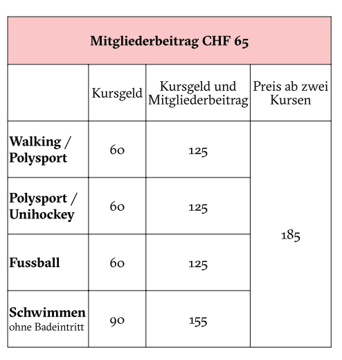 Der Grundbetrag pro Kurs ist CHF 60.-. Kommen wie beim Schwimmen noch Bahnmiete o.Ä. hinzu, wird dies berücksichtigt. So kostet das Schwimmen CHF 90.-. Werden mehrere Kurse besucht, bleibt es bei den Kosten für zwei Kurse, also maximal CHF 185.- pro Jahr inklusive Mitgliederbeitrag.